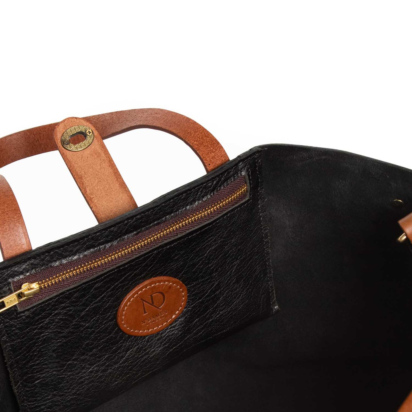 Contrasting chestnut leather straps, front strap twist lock closure, long adjustable strap with brass buckle closure, x 1 internal zip pocket & our iconic N'Damus London logo embossed to the front strap closure and x 2 side 12cm chestnut leather strap details.