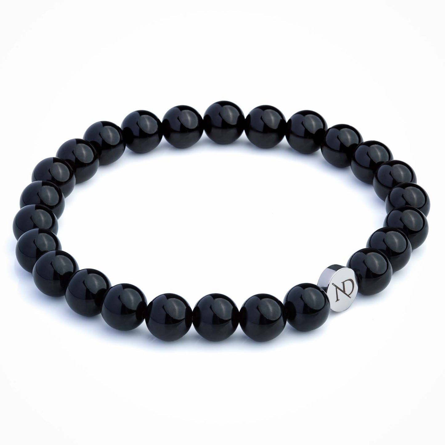 Black onyx gemstone wrist bracelet. Featuring 8mm smooth, round natural mineral black onyx gemstone beads, handcrafted together using high quality, clear elastic cord.