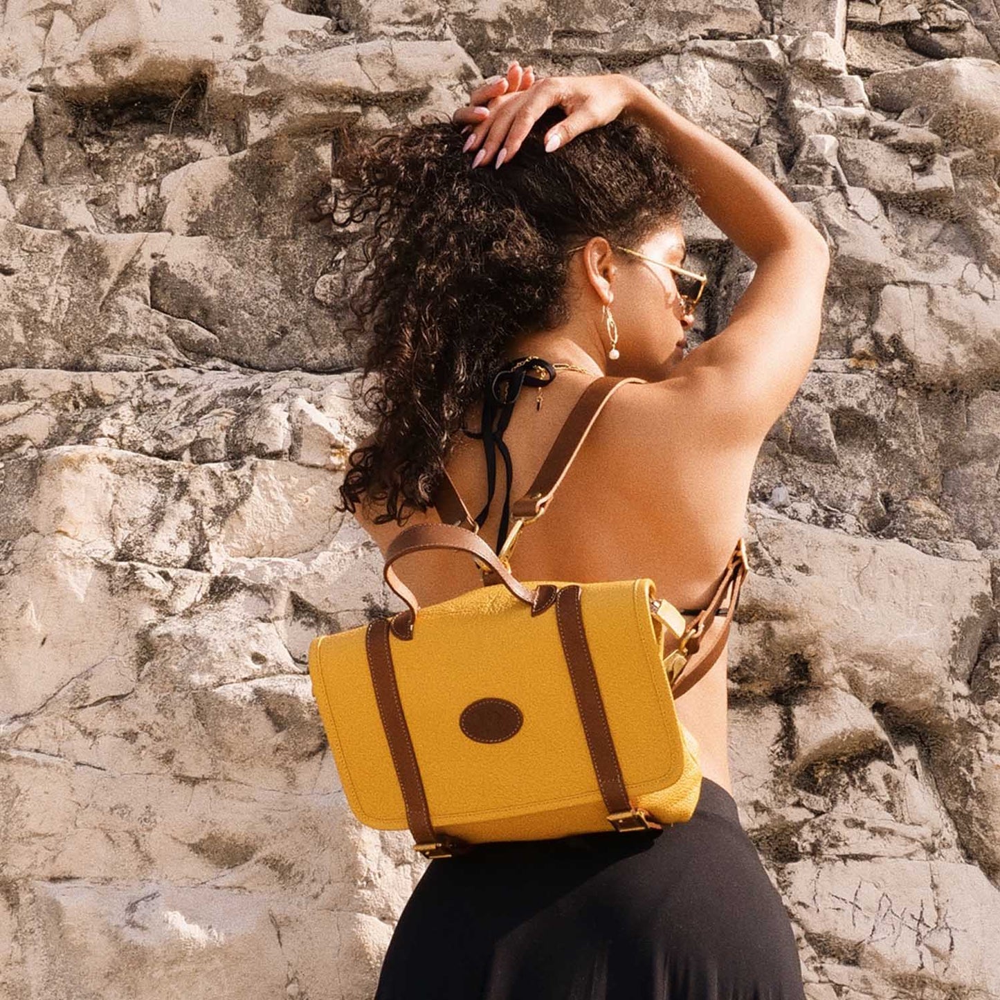 Featuring back open pocket, inside pocket, top grab handle & x 2 detachable & adjustable straps with solid brass clasps.